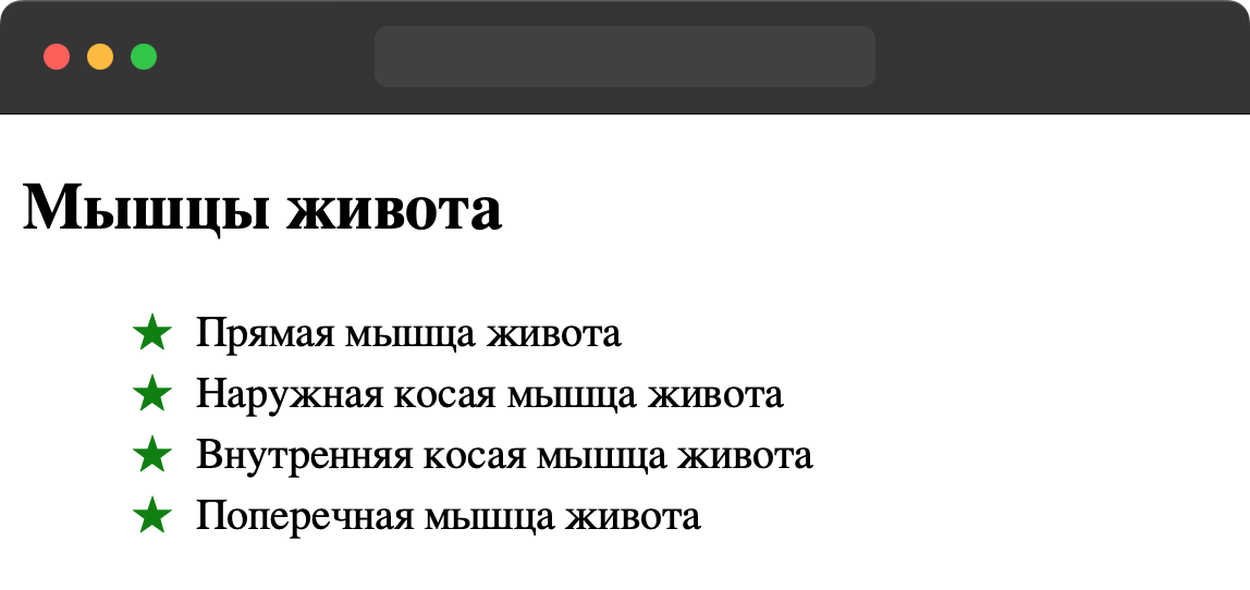 Список должен выглядеть одинаково в разных браузерах, включая Safari. В качестве маркера укажите следующий символ — ★.